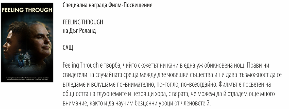 През 2020 г. филмът Feeling Through (Дълбоко усещане) бе отличен като Филм-Посвещение на първото издание на IPFF. Филм с кауза, филм за човека и човечността.